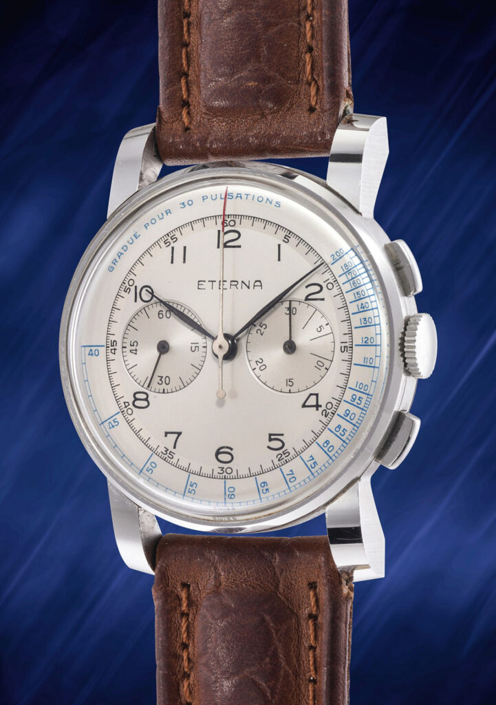 Однокнопочный хронограф в 37-миллиметровом стальном корпусе, выпущенный примерно в 1966 году. Особенность модели – наличие шкалы пульсометра, что позволяет измерять пульс и частоту дыхания. Шкала пульсометра откалибрована на 10 ударов пульса.