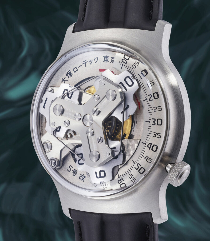 Часы в стиле стимпанк от независимого японца Дзиро Катаяма. В стальной корпус модели диаметром 40,5 мм установлен механизм с сателлитной индикацией. Уникальность этого лота в том, что модели от господина Катаяма продаются исключительно в Японии. Подробнее об этих часах мы писали в отдельной статье.