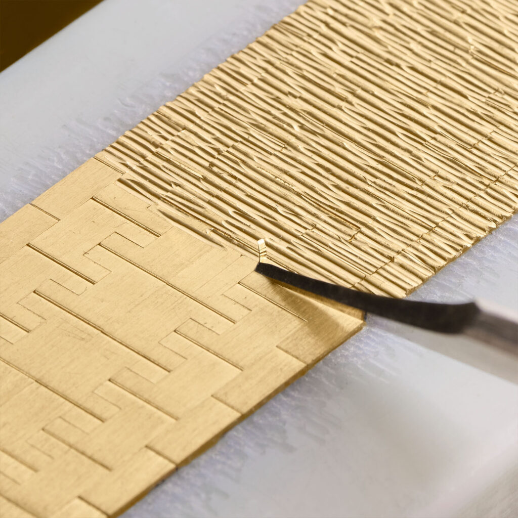 Первую отличает знаменитая гравировка Décor Palace, которую Piaget активно использовала в 1960-х годах. Она выполняется вручную при помощи резца с острым наконечником. В данном случае на циферблате и на браслете. На выходе получается узор из несимметричных горизонтальных полос, который напоминает шершавую древесную кору или текстурированную ткань.