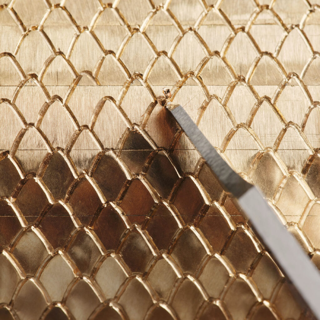 Техника закрепки носит название serti descendu. Одна из особенностей этой техники – на заключительном этапе из крепежных канавок и лапок удаляется «лишний» металл, чтобы свет мог проникать в камень с боков, а не только сверху.