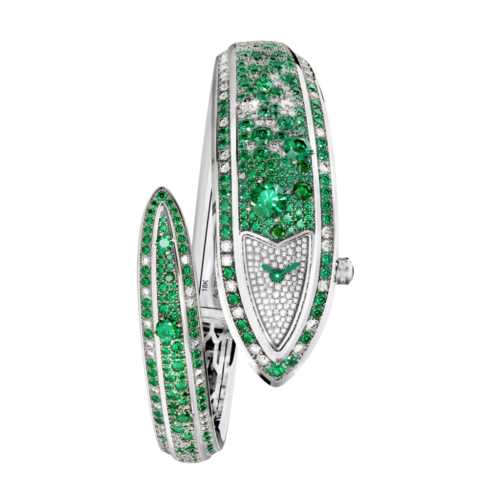 Эта модель представляет собой свежую интерпретацию культового дизайна Bvlgari Serpenti. Голова змеи приобрела заостренную форму, а тело-браслет стало более жестким и узким. Часы изготовлены из белого золота. Браслет инкрустирован 428 бриллиантами, 263 изумрудами разного размера. Голову рептилии венчает крупный изумруд весом 0,45 карат. Циферблат инкрустирован 107 бриллиантами.