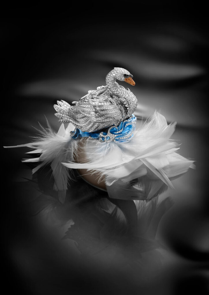 Часы в виде лебедя, величаво плывущего по озерной глади. Фигурка лебедя изготовлена из белого и желтого этического золота и инкрустирована белыми и черными бриллиантами. Птица покоится на основе из титана, которая изображает ту самую озерную гладь. Если повернуть голову лебедя к центру, птица плавно развернет крылья, каждое из которых состоит из 3 подвижных секций. Раскрывая крылья, лебедь показывает миниатюрный циферблат из перламутра.