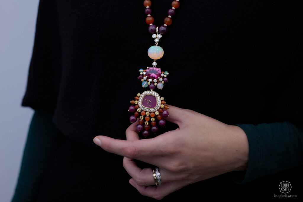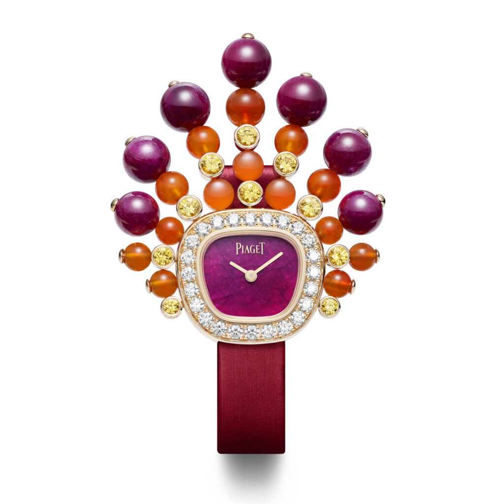 Часы как воплощение роскошного цветущего сада. Это ювелирное полотно создано из бриллиантов, розовых сапфиров разных оттенков и цаворитов разных видов огранки (бриллиантовая, грушевидная, овальная и «маркиза»). Только на отделку циферблата ушло больше 1000 камней. Корпус часов 38 мм в диаметре изготовлен из розового золота.