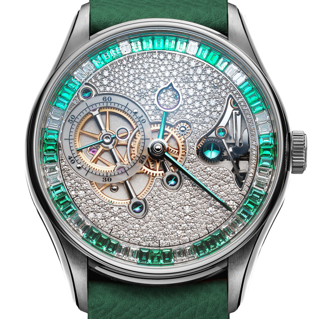 Часы, в которых ювелирная отделка подчеркивает великолепие механизма. Модель представлена в корпусе из платины и дополнена циферблатом, инкрустированным 300 бриллиантами в технике «снежной закрепки». Плотный ковер из мелких бриллиантов обрамляет кольцо с крупными бриллиантами и изумрудами багетной огранки. Благодаря ALD-технологии винты и стрелки на часах меняют цвет от зеленого до фиолетового.