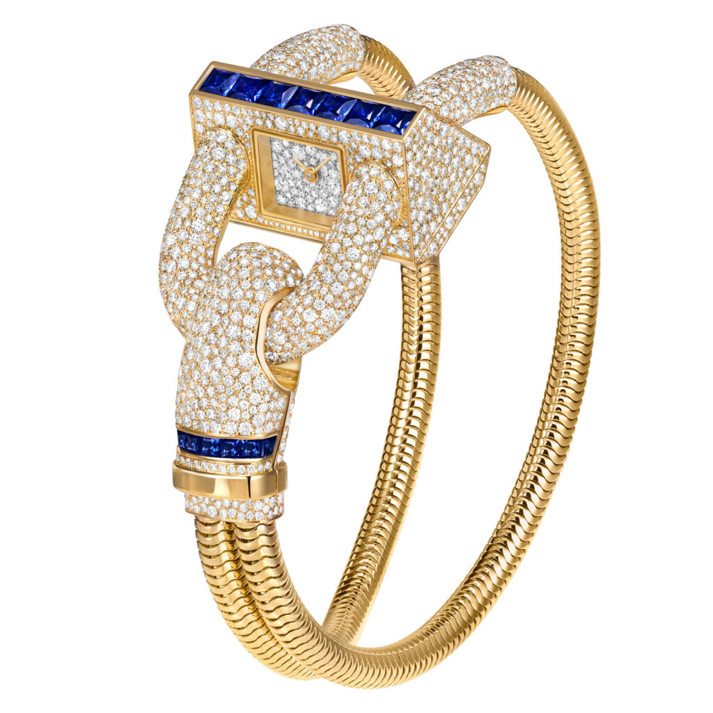 Часы Van Cleef & Arpels в форме замка появились на свет еще в 1935 году. В свежей интерпретации они получили корпус и браслет из желтого золота. В отделке корпуса и крепления-замка использованы бриллианты в технике снежной закрепки, а также 2 ряда синих сапфиров огранки «принцесса». Внутри корпуса стоит кварцевый механизм. Ориентировочная стоимость часов составляет CHF 163,000.