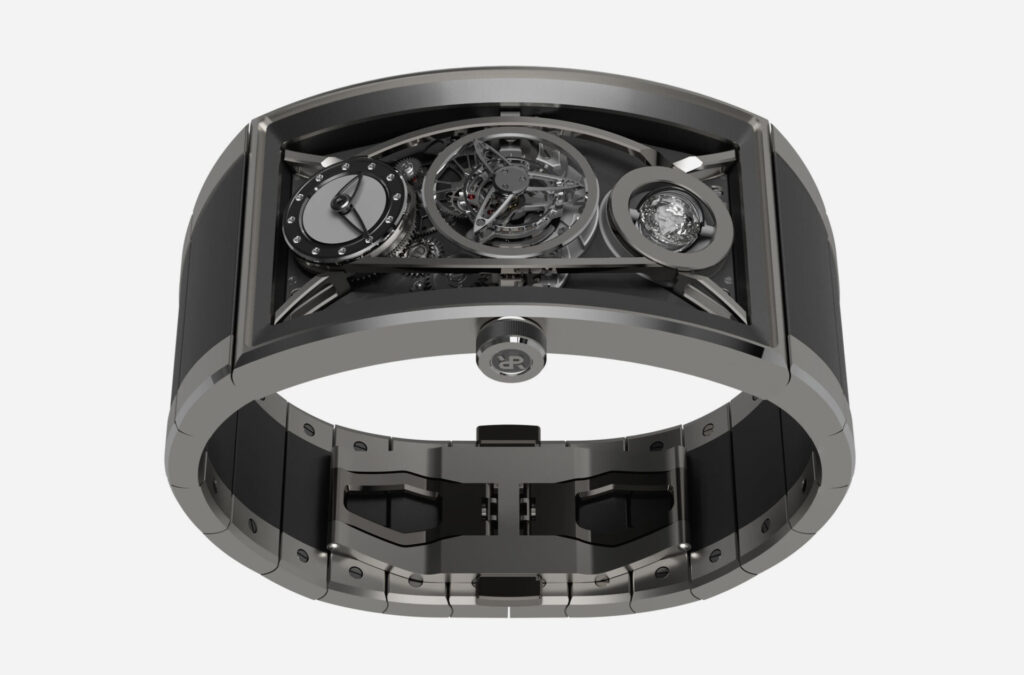 И сами часы, и установленный в них механизм с ручным подзаводом были разработаны группой специалистов. В нее вошли часовой конструктор из Artime и специалист по сложным механизмам Vanguart. Часы будут поставлять как на ремешке из кожи (CHF 120,000), так и на титановом браслете (CHF 150,000).