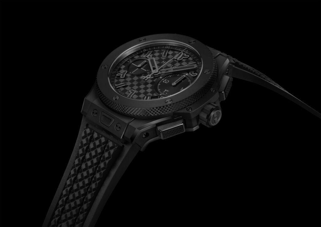Лимитированная серией 10 экземпляров модель Hublot Big Bang All Black Ahmed Seddiqi 75th Anniversary получила корпус из черной керамики и механизм с ротором из 22-каратного золота. Заводная головка и кнопки хронографа титановые, с каучуковым покрытием на заводной головке и каучуковыми вставками на кнопках.