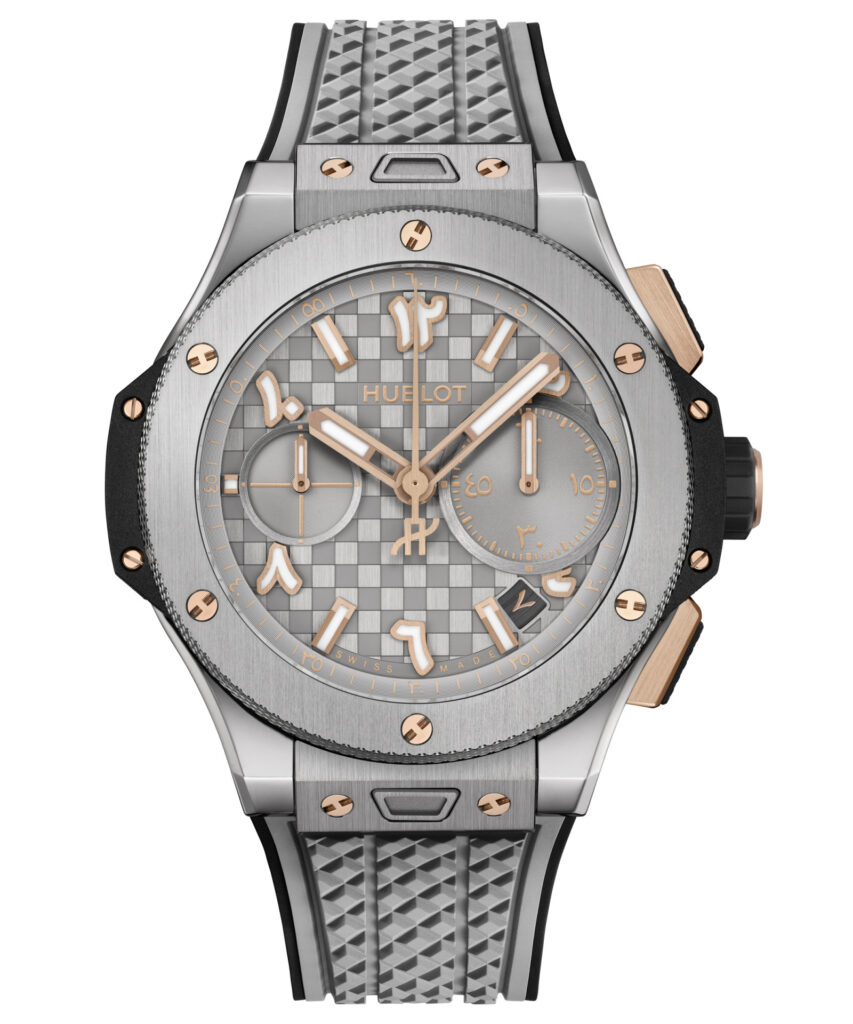 Лимитированная серией 25 экземпляров модель Hublot Big Bang Titanium Grey Ahmed Seddiqi 75th Anniversary получила титановый корпус с чередованием полировки и сатинирования в отделке. Заводная головка и кнопки хронографа выполнены из сплава King Gold и также оформлены каучуком.