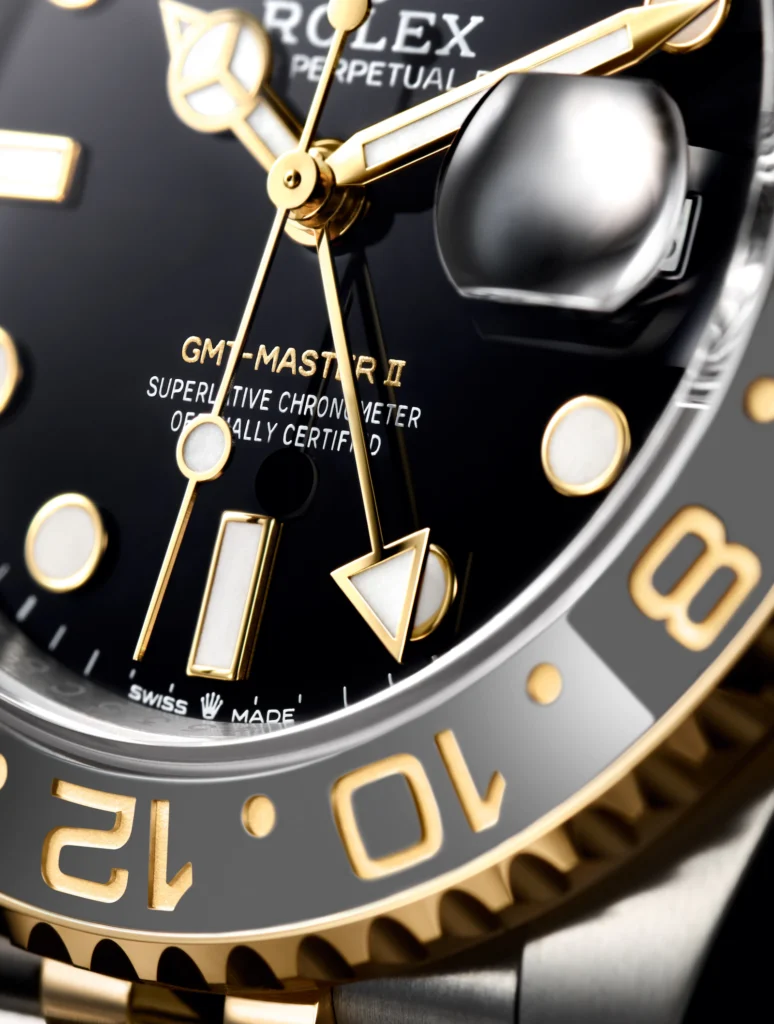В новых версиях часов GMT‑Master II эта стрелка выполнена из 18‑каратного желтого золота, как и часовые указатели и три другие стрелки, создавая элегантный контраст с черным лакированным циферблатом.