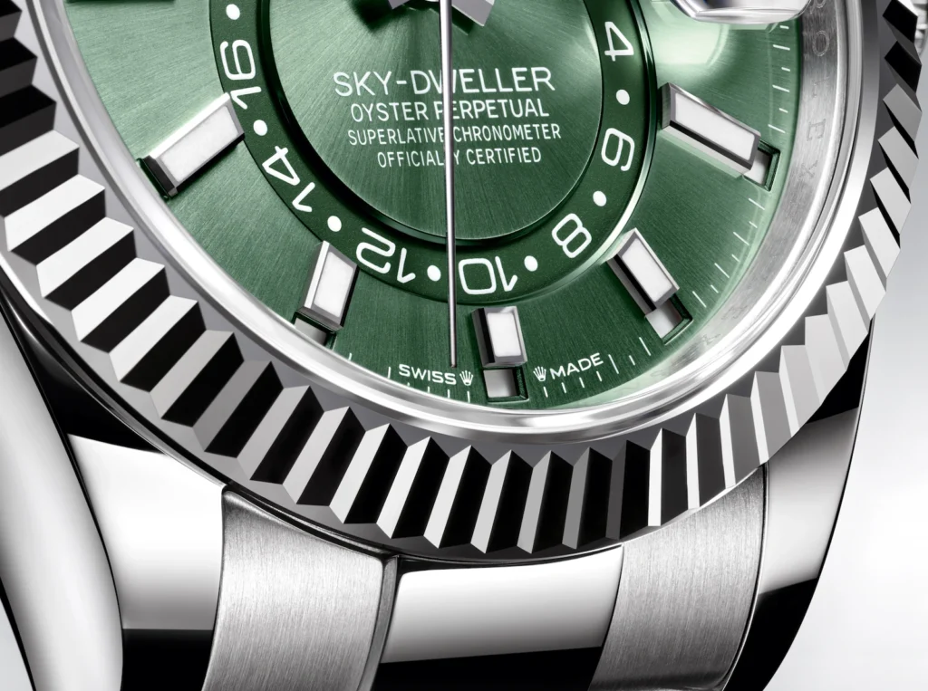 Новая версия часов Sky‑Dweller отмечает возвращение 18‑каратного белого золота в гамму. Этот драгоценный металл сочетается с ослепительно‑черным циферблатом и впервые предлагается с браслетом Oysterflex, оснащенным застежкой Oysterclasp и системой удлинения Glidelock для лучшего комфорта при ношении. Также в оформлении Sky‑Dweller появились новые цвета циферблата: изысканный цвет зеленой мяты в стиле Rolesor белого цвета и элегантный сине‑зеленый исключительно в версии из 18‑каратного золота Everose с браслетом Oyster.