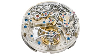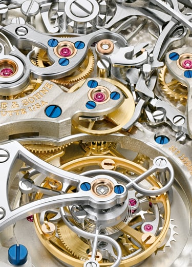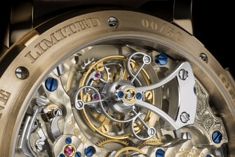 Атрибут TOURBILLON относится к одноминутному турбийону с механизмом остановки секунд; он компенсирует влияние гравитации на идущий поезд. Раз в минуту он вращает компоненты, регулирующие скорость — баланс, рычаг и эвакуационное колесо — внутри филигрной клетки вокруг своей собственной оси вокруг стационарного четвертого колеса. Очень эстетичное и часологически сложное устройство повышает точность механических часов.