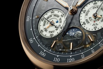 Архитектура циферблата, состоящая равносторонний треугольник, образованный негабаритной датой Ланге в обрамлении с двумя вспомогательными циферблатами, является хорошо организованной моделью четкости, несмотря на обилие дисплеев. Вспомогательная секундная циферблат, день недели и индикатор дня/ночи расположены с левой стороны, в то время как счетчик точно прыгающих минут, месяц и восный год можно найти справа. Дисплей фазы луны в 6 часов гармонично встроен в ансамбль.