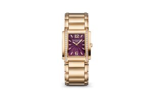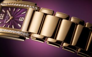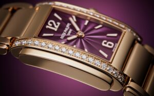 По случаю 25-летия женской коллекции Twenty~4, ставшей синонимом неподвластной времени элегантности, Patek Philippe представляет новую версию кварцевых часов в форме браслета с необыкновенно элегантным циферблатом. Пластина циферблата была украшена рельефным узором в виде концентрических волн и последовательно покрыта десятками слоев фиолетового и полупрозрачного лака, создающего завораживающий эффект глубины.