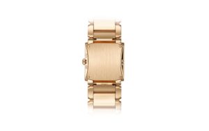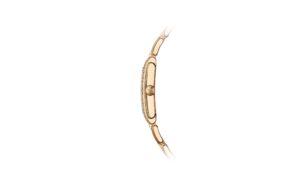 Оригинальную форму прямоугольного двухуровневого корпуса подчеркивают два ряда бриллиантов классической огранки (0,63 карата), по 17 в каждом, расположенных по обе стороны циферблата.