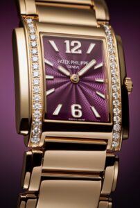 По случаю 25-летия женской коллекции Twenty~4, ставшей синонимом неподвластной времени элегантности, Patek Philippe представляет новую версию кварцевых часов в форме браслета с необыкновенно элегантным циферблатом. Пластина циферблата была украшена рельефным узором в виде концентрических волн и последовательно покрыта десятками слоев фиолетового и полупрозрачного лака, создающего завораживающий эффект глубины.