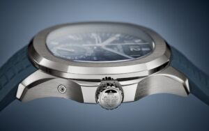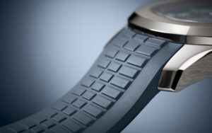Опаловый циферблат сине-серого цвета украшен фирменным узором Aquanaut, а интегрированный ремешок из композитного материала в тон циферблату оснащен запатентованной раскладывающейся застежкой из белого золота.