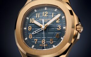 Сине-серый опаловый циферблат с тисненым узором Aquanaut, накладные цифры из розового золота.
