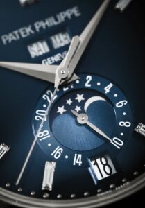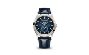 Patek Philippe представляет новую версию своих знаменитых мужских часов с годовым календарем (Мод. 5396): корпус выполнен из белого золота, а синий циферблат с узором «солнечные лучи» и черным градиентным окаймлением украшен двенадцатью часовыми метками из бриллиантов багетной огранки (0,26 карата). В тон циферблату подобран темно-синий ремешок из блестящей кожи аллигатора.