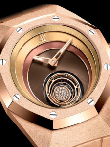 Легендарный восьмигранный безель модели Royal Oak из 18-каратного розового золота и верхние поверхности шестиугольного корпуса имеют специальный финиш. Ярко выраженный полированный наклон безеля резко контрастирует со сдержанным блеском. Наряду с сатинированными боковыми сторонами корпуса эти контрастные текстуры подчеркивают динамичную архитектуру Royal Oak Concept. Шестигранная заводная головка из розового золота, повторяющая форму фирменных шестиугольных стальных винтов на безеле, украшена полупрозрачным сапфиром огранки кабошон на кончике.