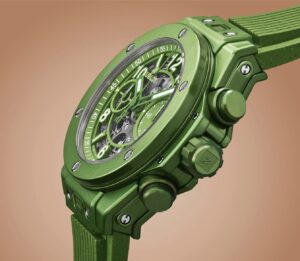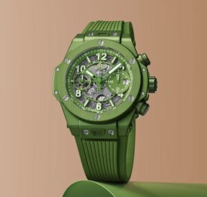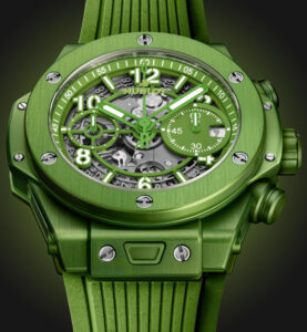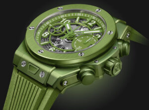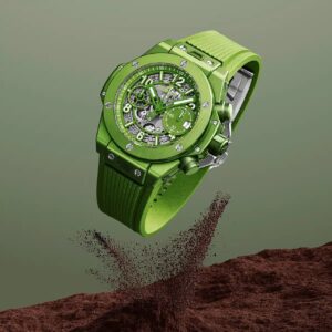 Хотя основной дизайн этих часов существует уже несколько лет, по сообщениям, команде отдела исследований и разработок Hublot потребовался целый год тесного сотрудничества с Nespresso, чтобы добиться сочетания ярких зеленых оттенков, которые проявляются в семи различных материалах, используемых для создания корпуса, циферблата, стрелок и ремешков новых часов Big Bang Unico Nespresso Origin.