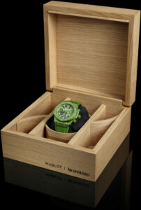 Как и сами часы, коробка для новых Hublot Big Bang Unico Nespresso Origin также делает упор на экологичность. Она изготовлена в новом стиле, который будет использоваться для всех будущих коллекций Hublot. Корпус, известный как «Hublot Greenbox», полностью изготовлен из дуба (включая петли), происхождение древесины отслеживается, а ее производство выбрано для обеспечения коротких цепочек поставок. Коробка, предназначенная для повторного использования для личного хранения, имеет съемную внутреннюю часть, которая на 98% состоит из переработанных компонентов, таких как ткани, пластиковые нити и ПЭТ, а также переработанная бумага и картон с экологической маркировкой. В качестве последнего штриха дизайна, связанного с эспрессо, на деревянную коробку нанесены логотипы Hublot и Nespresso с использованием кофейной гущи из переработанных капсул Nespresso.