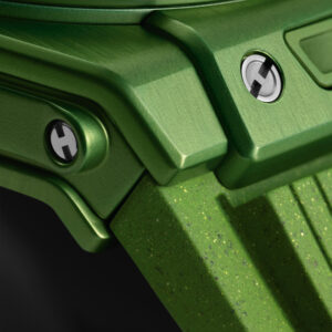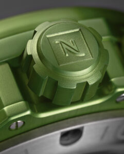 По сравнению с предыдущими алюминиевыми хронографами Big Bang, наиболее очевидным визуальным обновлением нового Hublot Big Bang Unico Nespresso Originявляется его яркий зеленый цвет, покрывающий весь корпус и ремешок, а также скелетированный циферблат и стрелки. Этот специфический оттенок зеленого — тот же оттенок, что и у кофейных капсул Nespresso «Master Origins Peru Organic», и в качестве еще одного дизайнерского намека на это довольно необычное сотрудничество зеленая алюминиевая заводная головка подписана знаменитым логотипом Nespresso «N».
