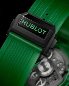 Полностью зеленая тема Hublot Big Bang Unico Green SAXEM распространяется и на циферблат, и хотя фактический дизайн и компоновка идентичны остальным моделям серии, все различные маркировки и элементы дизайна теперь отображаются в ярком цвете.