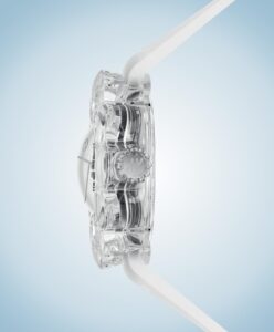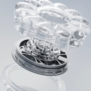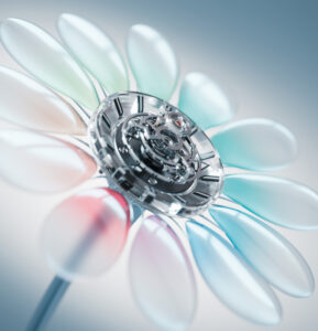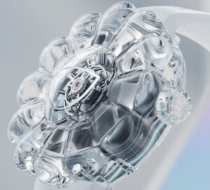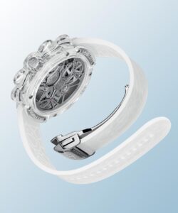 Ремешок изготовлен из полупрозрачного каучука и оснащен раскладывающейся титановой застежкой, украшенной декоративной сапфировой вставкой. Поскольку корпус, по сути, представляет собой прозрачную скульптуру сапфирового цветка, у него нет каких-либо выступов в традиционном смысле этого слова.