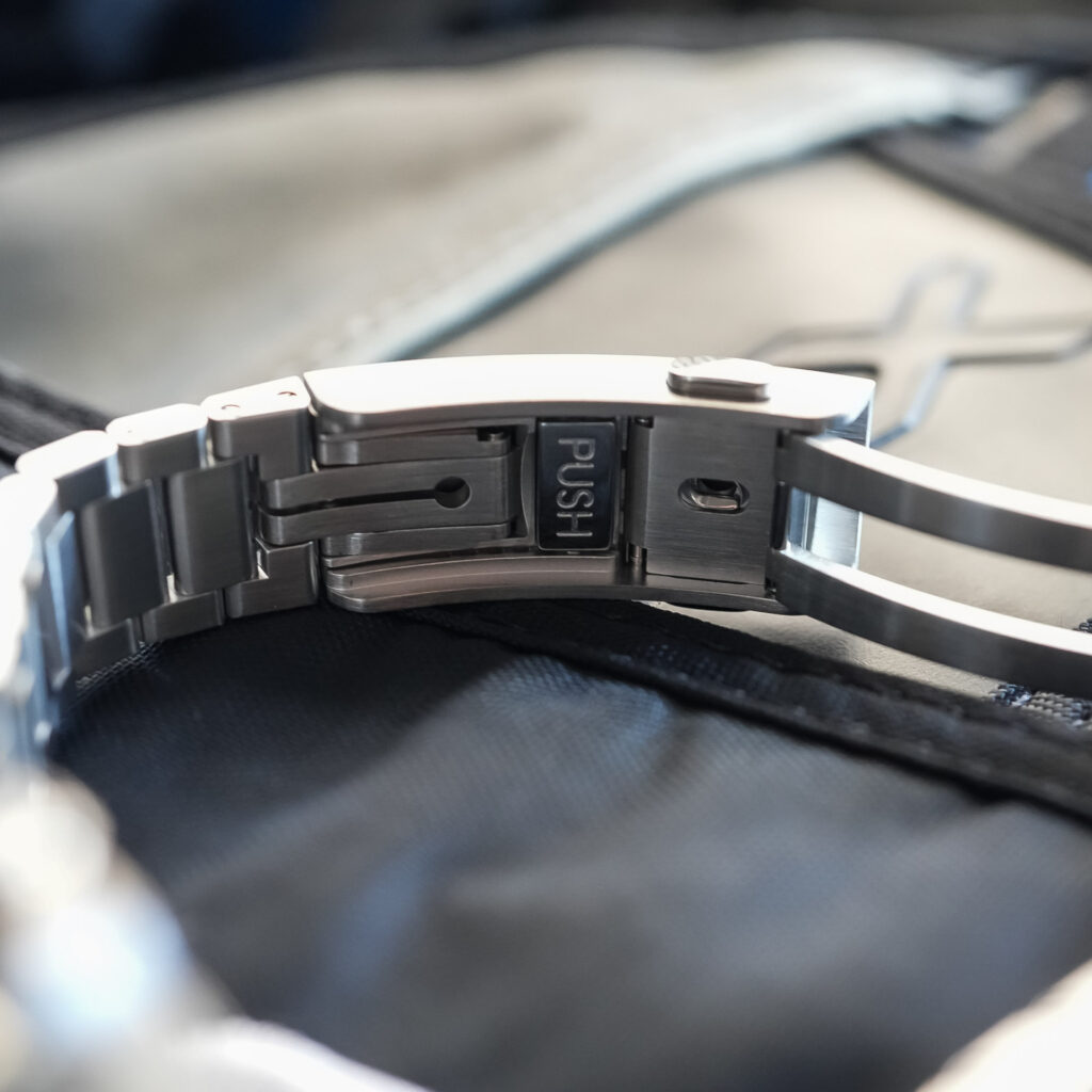 Браслет теперь плоский, трехзвенный, с матовыми внешними и полированными внутренними звеньями. Он стал тоньше и за счет первого шарнирного звена визуально воспринимается как интегрированный в корпус. Застегивается браслет на регулируемую в 6 положениях раскладывающуюся застежку. Как и положено в случае с дайверами, он оснащен механизмом удлинения, чтобы часы можно было надевать поверх дайверского костюма.