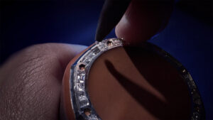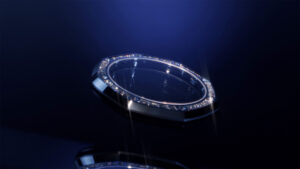 Нужный оттенок создается с помощью вакуумного напыления (Physical Vapour Deposition, PVD), а дымчатый эффект по окружности достигается аккуратным распылением черного лака на вращающийся циферблат.