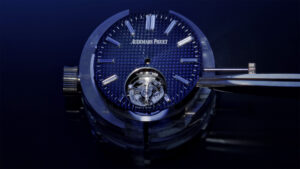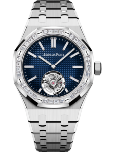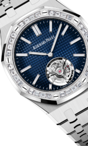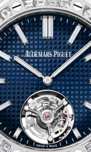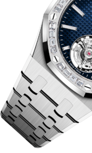 Дымчато-синий циферблат с узором «Petite Tapisserie», часовые метки с бриллиантами багетной огранки, стрелки Royal Oak из белого золота с осажденным люминесцентным покрытием.