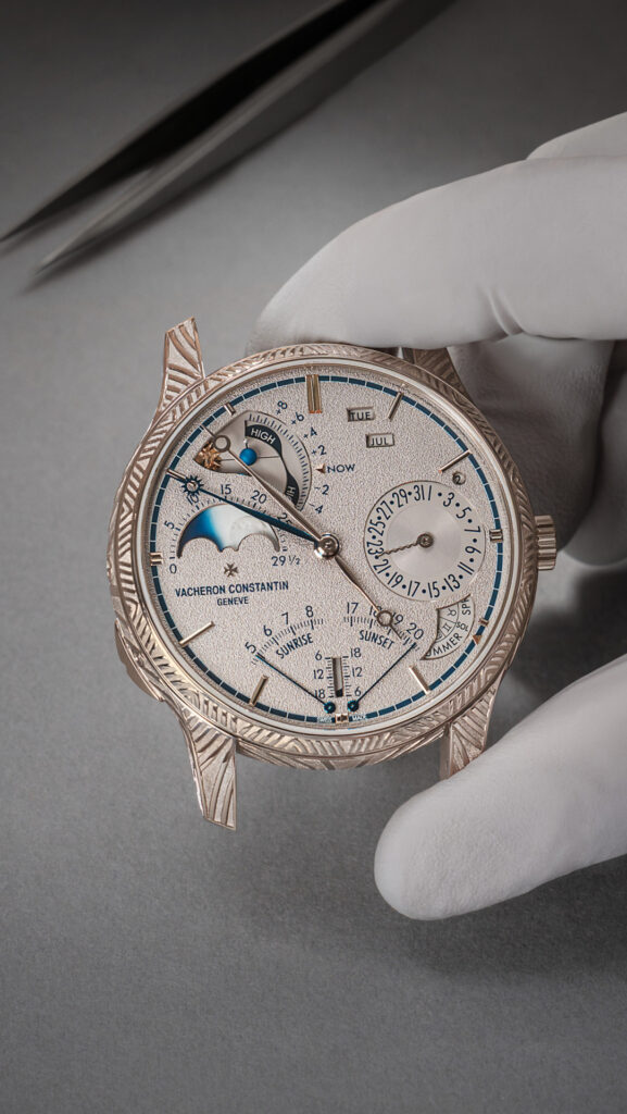 Модель Celestia Astronomical Grand Complication отображает время в 3 форматах: гражданское, солнечное и звездное, и каждая из этих индикаций оснащена отдельной колесной передачей. Если гражданское время – это время, по которому мы живем, то солнечное время учитывает эллиптическую траекторию движения Земли вокруг Солнца и наклон земной оси. Из-за этого в течение года реальное (солнечное) немного отличается от гражданского. Эту разницу показывает усложнение под названием уравнение времени. На часах оно отображается дополнительной минутной стрелкой с наконечником в форме солнца.